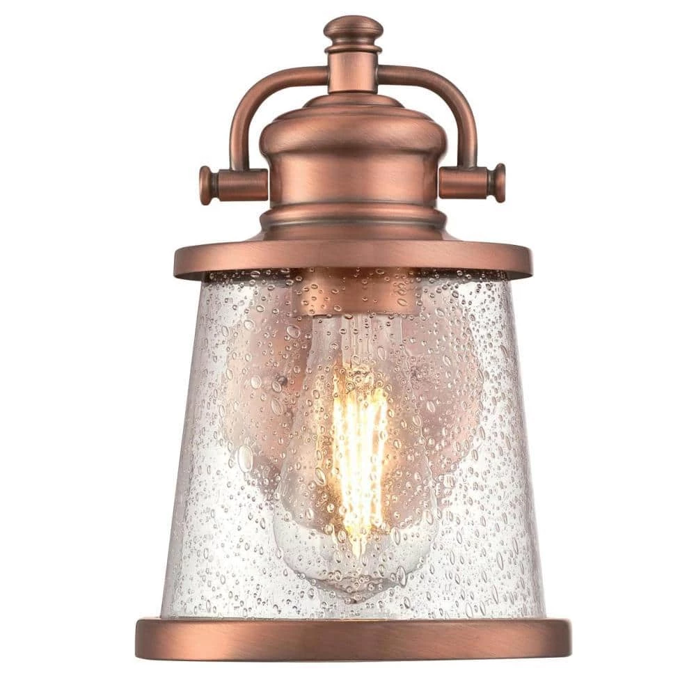 - Washed copper finish wall fixture with clear seeded glass adds warm inviting ambiance