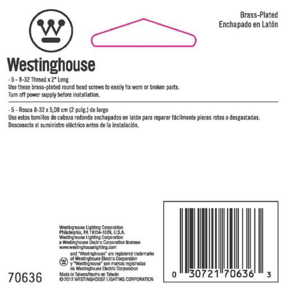 Repair lighting fixtures with the Westinghouse Five 2 in. Brass-Plated Steel Round Head Screws hardware set. These screws all have an 8-32 thread and are 2 in. long, so they work well for a variety of repair or building projects. Their round head style is useful for more decorative applications. Since they are made from brass-plated steel, these screws are strong enough to support your projects with the durability you need. Westinghouse is a global brand with a simple philosophy: make life easier for everyone who buys its products. The company offers ceiling fans, lighting fixtures, lighting hardware, lighting accessories and light bulbs for both consumer and commercial applications. Westinghouse products are designed for exceptional quality, reliability and innovation. Product reference number 70636.