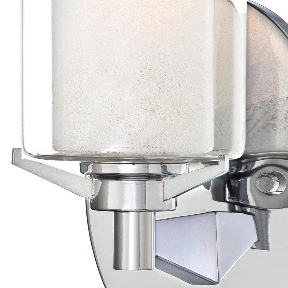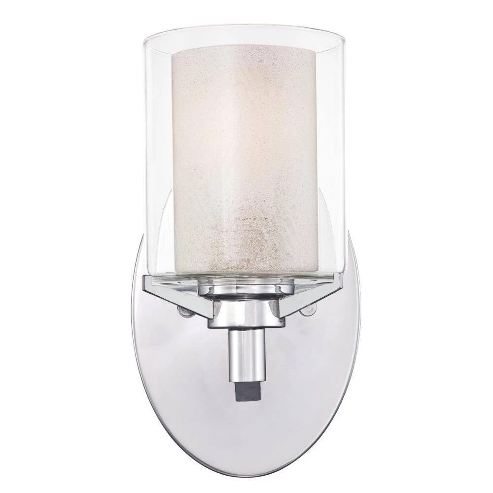 The understated Glenford 1-Light Wall Fixture is distinguished by its clean lines and distinctive glass. Dual ice and clear glass cylinders add sparkling illumination, while the chrome finish adds stunning style. Install this wall fixture in the bathroom, over a vanity or in pairs, to highlight a focal point over your mantle. The wall fixture measures 8-11/16 in. x 5-5/16 in. (H x W), extends 7-1/4 in. from the wall and back plate 7-7/8 x 5-5/16 in. (H x W).This Westinghouse indoor wall fixture is UL/CUL listed for safety. It is backed by a 5-year limited manufacturer’s warranty against defects in materials and workmanship. Product reference number 63315.