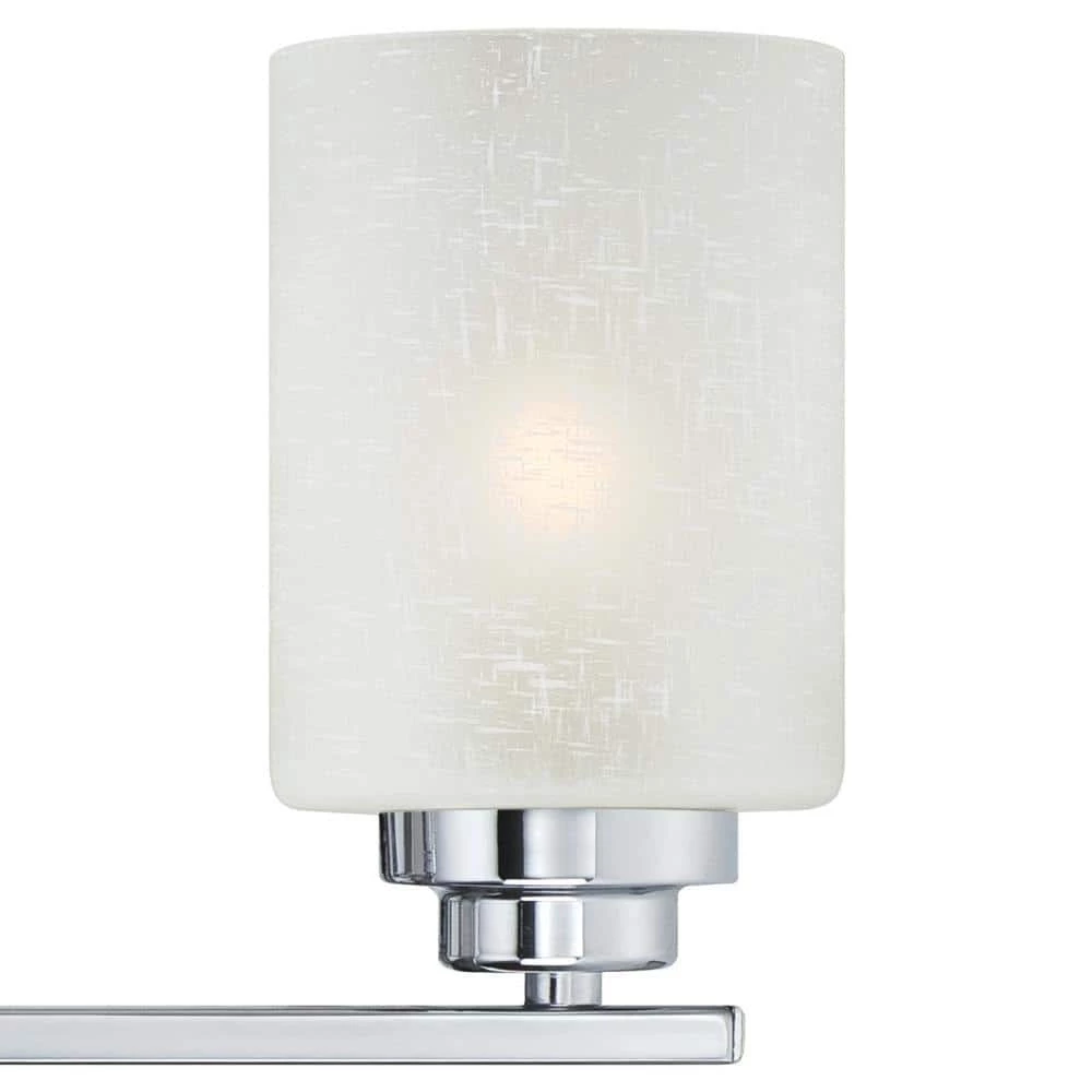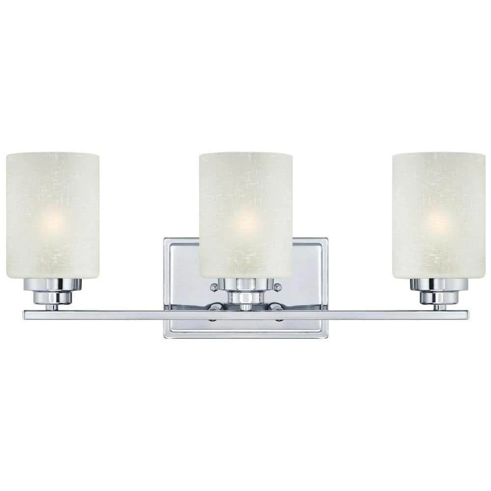 The Westinghouse Hansen 3-Light Wall Fixture adds sophisticated transitional look to your home. This fixture features a luminous chrome finish which accentuates its classic lines. 3 white linen cylinder shades add dimension and texture while filtering the light for inviting illumination. Install this wall fixture in the bathroom, vanity or dining room for a refined touch. Its larger size works well for bigger rooms. You can position the fixture up or down to suit your needs. The fixture is 7-13/16 in. x 19-11/16 in. (H x W) and extends 6-1/2 in. from the wall. This Westinghouse indoor wall fixture is ETL/CETL listed for safety. It is backed by a 5-year limited manufacturer’s warranty against defects in materials and workmanship. Westinghouse is a global brand with a simple philosophy: make life easier for everyone who buys its products. Westinghouse products are designed for exceptional quality, reliability, and functionality. Product reference number 63438B.