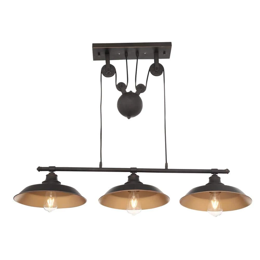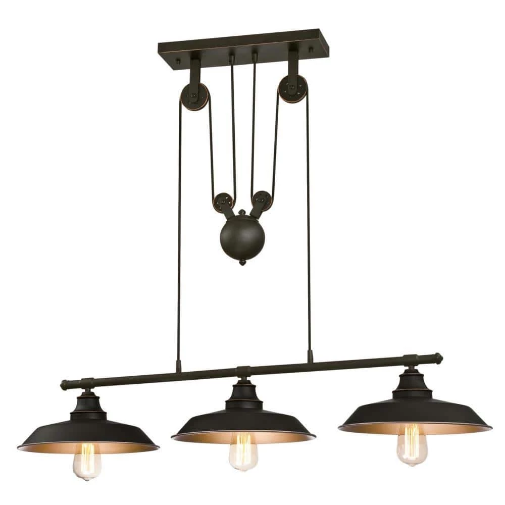 The Westinghouse Iron Hill 3-Light Island Pulley Pendant provides a vintage industrial accent for your home. Oil rubbed bronze finish with highlights adds rustic appeal perfect for farmhouse kitchens or urban lofts. The metallic bronze finish inside the metal shades provides a warm glow and creates a nice contrast to the overall pendant finish. The adjustable pulley system adds vintage charm and allows easy adjustment of the pendant height. This iconic pendant sets the right tone in a vintage farmhouse or industrial loft. Perfect over a kitchen island, breakfast bar, pool table or dining room table. The pendant measures 31-15/16 in. x 39-15/16 in. (H x W), depth 12 in. and has a maximum hanging length of 58-15/16 in. and minimum hanging length of 31-15/16 in. Westinghouse is a trusted, global brand. Westinghouse knows lighting and offers products with exceptional quality, reliability and functionality. Product reference number 63325.