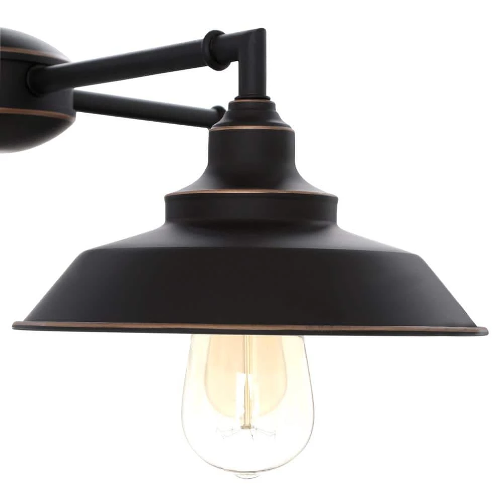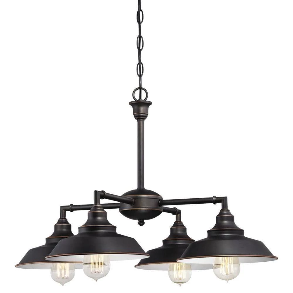 This warm, four-light chandelier converts into a semi-flush ceiling fixture. Designed for multiple installation options, this piece features barn-shaped metal shades to add a vintage industrial accent to your home. Its oil-rubbed bronze highlights add a rustic appeal. The semi-flush option is great for foyers, living rooms and bedrooms while the chandelier choice is ideal for entryways and dining rooms.