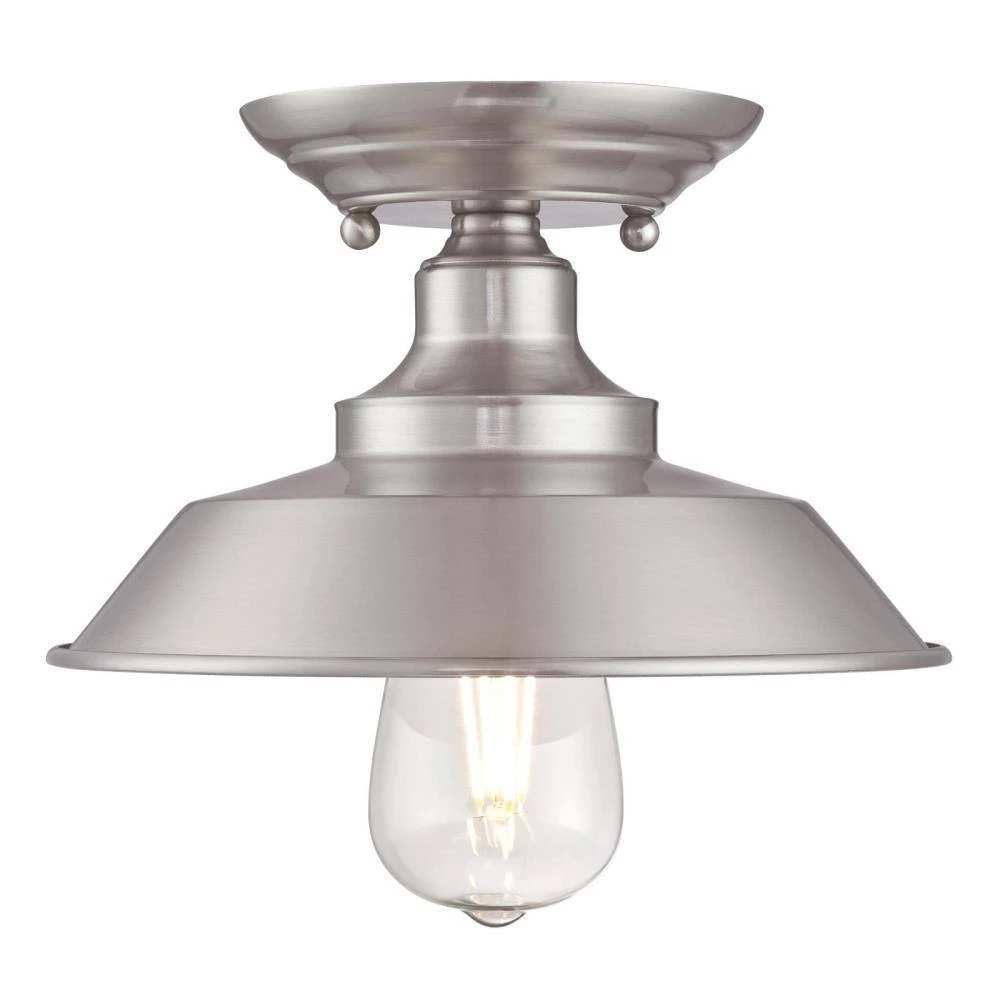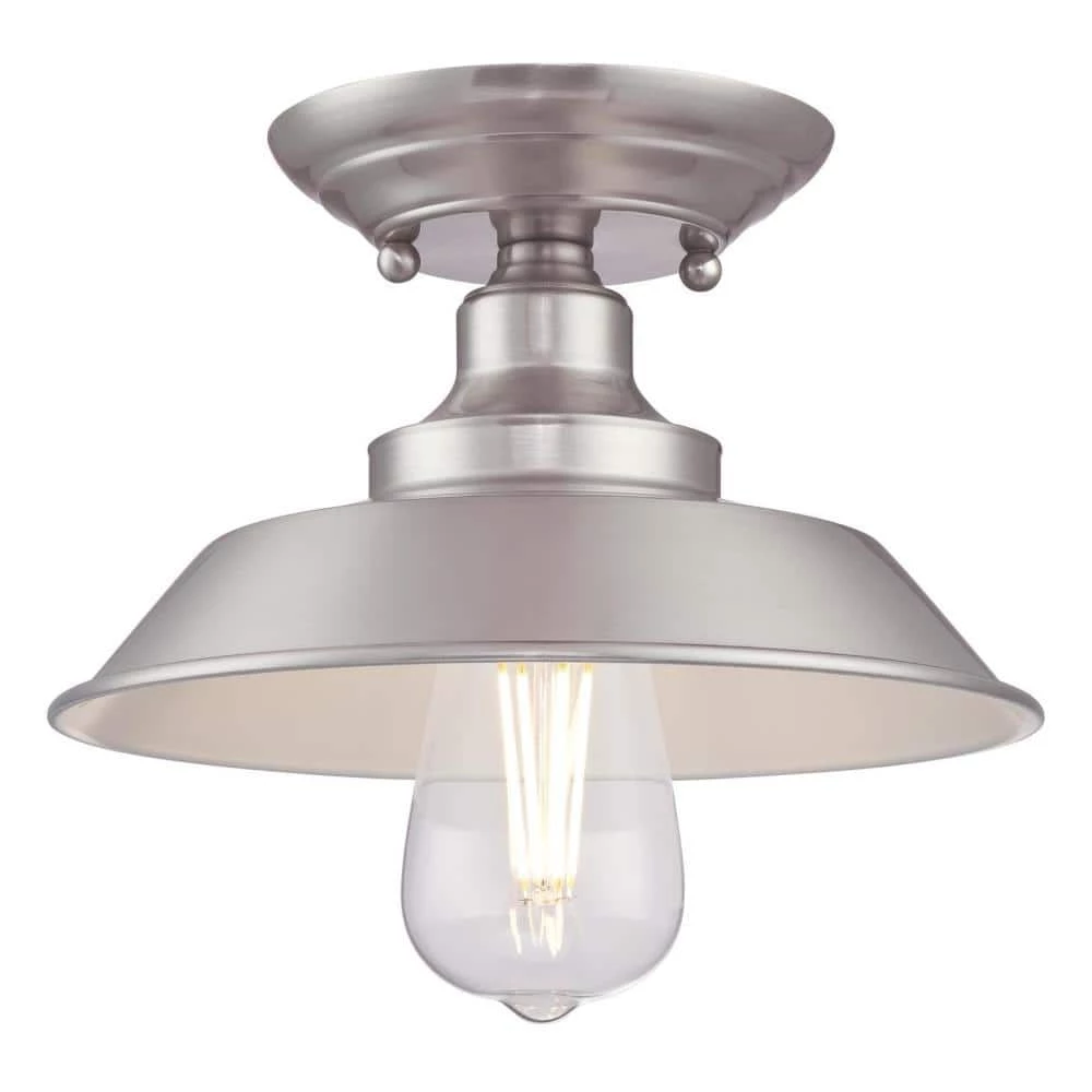 The Westinghouse Iron Hill semi-flush mount brings vintage-industrial style to your home. Sleek brushed nickel finish on an antique style shade adds retro style with modern-day appeal to any setting. The white finish inside the shade adds 2-tone charm while enhancing the bright illumination. This vintage ceiling fixture will add style and inviting illumination to your home when installed in a hallway, foyer, living room, dining room or bedroom. The semi-flush mount measures 5-5/16 in. x 8-11/16 in. (H x D). Westinghouse is a trusted, global brand. Westinghouse knows lighting and offers products with exceptional quality, reliability and functionality. Product reference number 63700.
