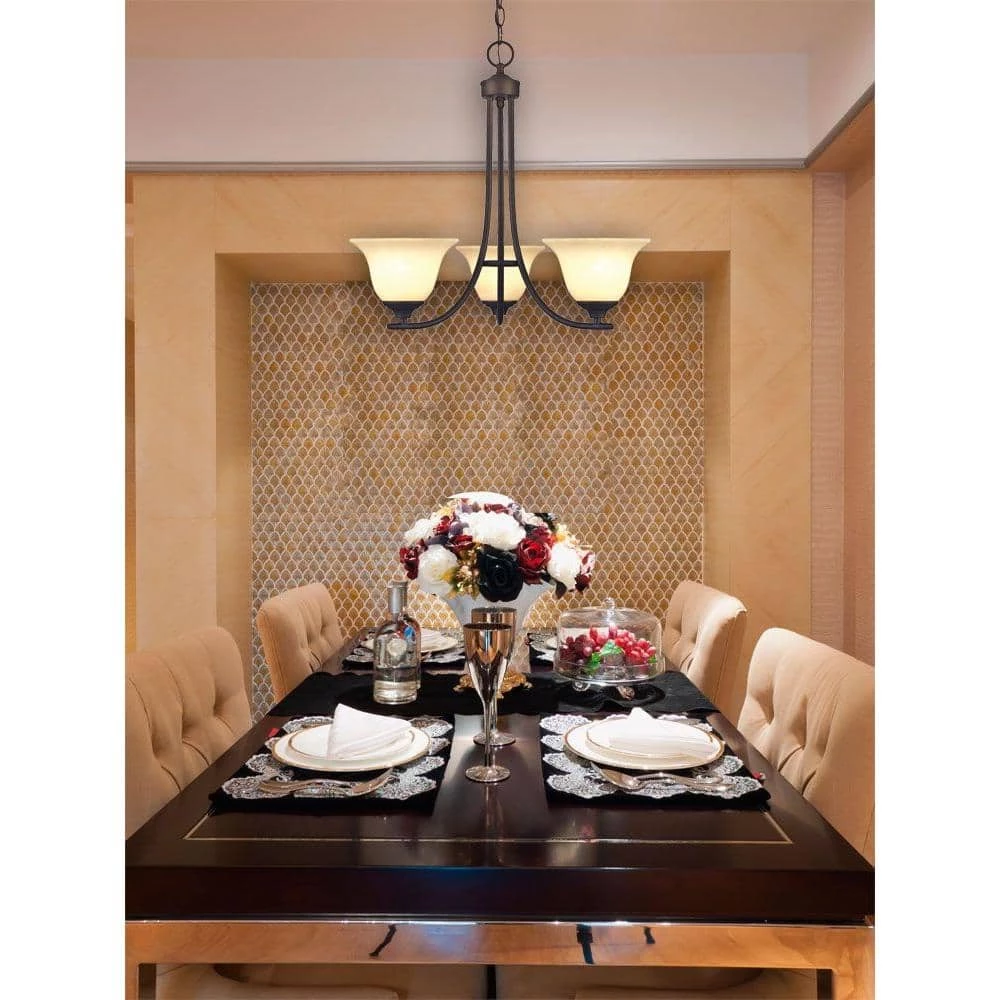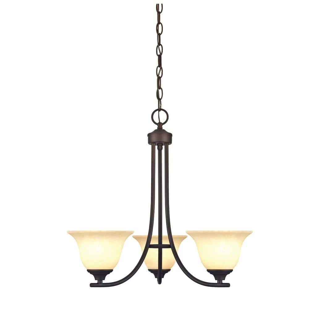 The Westinghouse Kings Canyon 3-Light Chandelier provides a modern addition to your dining room or entryway. Burnt scavo glass shades sit atop gently curved arms with an oil rubbed bronze finish. This fixture is ideal for dining and living rooms or other larger spaces. The burnt scavo glass will help create diffuse light no matter where the fixture is placed. The fixture is 20-1/8 in. x 22-1/8 in. (H x D) and comes with a 36 in. chain and 120 in. electrical wire. This Westinghouse interior chandelier is UL listed for safety. It is backed by a 5-year manufacturer’s warranty against defects in materials and workmanship.