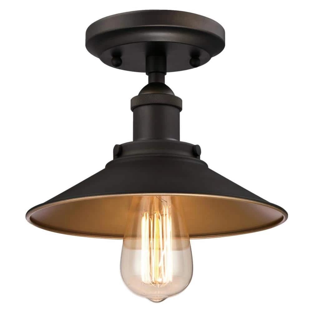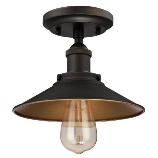 The Louis 1-Light Semi-Flushmount with its rich oil rubbed bronze finish adds industrial-style details with nostalgic appeal. The metallic bronze shade interior provides a warm glowing contrast to the overall dark finish of this fixture. This vintage ceiling fixture will add style and charming illumination to your home when installed in a hallway, foyer, living room, dining room or bedroom. The semi-flushmount measures 6-7/8 in. x 9 in. (H x D).This Westinghouse indoor ceiling fixture is backed by a 5-year limited manufacturer’s warranty against defects in materials and workmanship. Westinghouse is a trusted, global brand. Westinghouse knows lighting and offers products with exceptional quality, reliability and functionality. Product reference number 63360.