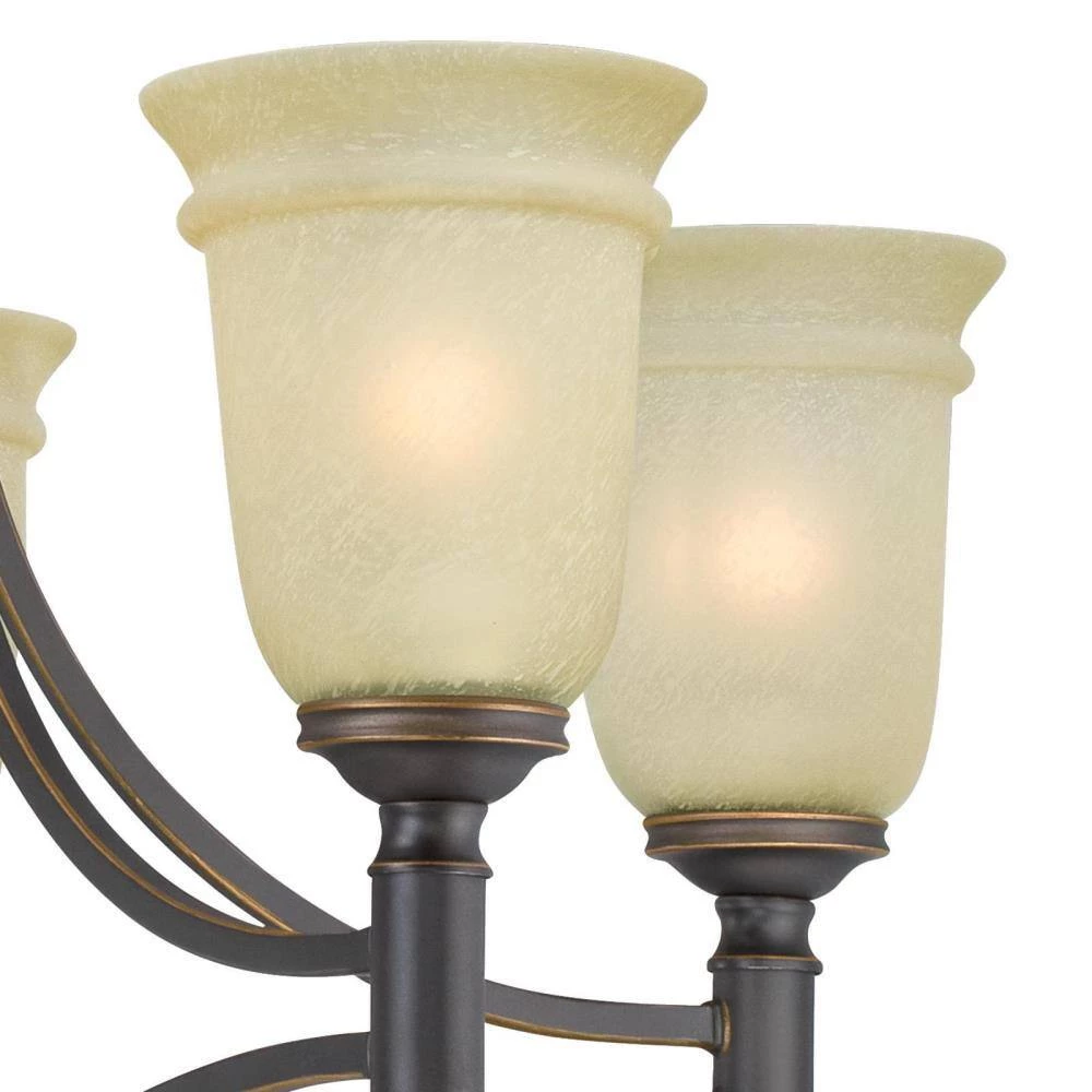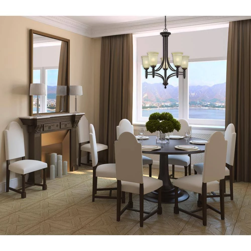 The Westinghouse Montrose 5-Light Chandelier creates a warm, inviting focal point in your home. This fixture features oil rubbed bronze finish with rich bronze highlights and elegant traditional design. Mocha scavo bell shades with a raised band adds sophistication and filters the light for graceful illumination for overall lighting. Install this chandelier in a foyer, living room, or dining room. The chain mount makes it ideal for rooms with high ceilings. The chandelier is 27-7/16 in. x 23-1/2 in. (H x D) and comes with a 36 in. chain and 60 in. cord. This Westinghouse indoor hanging fixture is ETL/CETL listed for safety. It is backed by a 5-year limited manufacturer’s warranty against defects in materials and workmanship. Westinghouse is a global brand with a simple philosophy: make life easier for everyone who buys its products. Westinghouse products are designed for exceptional quality, reliability, and functionality. Product reference number 63429.