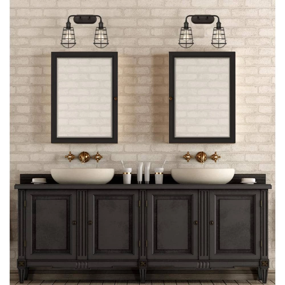 This Oliver 2-Light Wall Fixture, crafted to look like the originals of the early 20th century, is enhanced by an oil rubbed bronze finish. The open metal cage shades add a nostalgic feel and a latch on the bottom of the shade allows easy access for bulb changes. Install this wall fixture in the bathroom, over a vanity or in a dining room for a touch of timeless ambience. The wall fixture measures 13-13/16 in. x 18-11/16 in. (H x W), extends 8-7/16 in. from the wall and back plate 3-15/16 in. by 9-13/16 in. (H x W).This Westinghouse indoor wall fixture is ETL/CETL listed for safety. It is backed by a 5-year limited manufacturer’s warranty against defects in materials and workmanship. Westinghouse is a trusted, global brand. Westinghouse knows lighting and offers products with exceptional quality, reliability and functionality. Product reference number 63377.