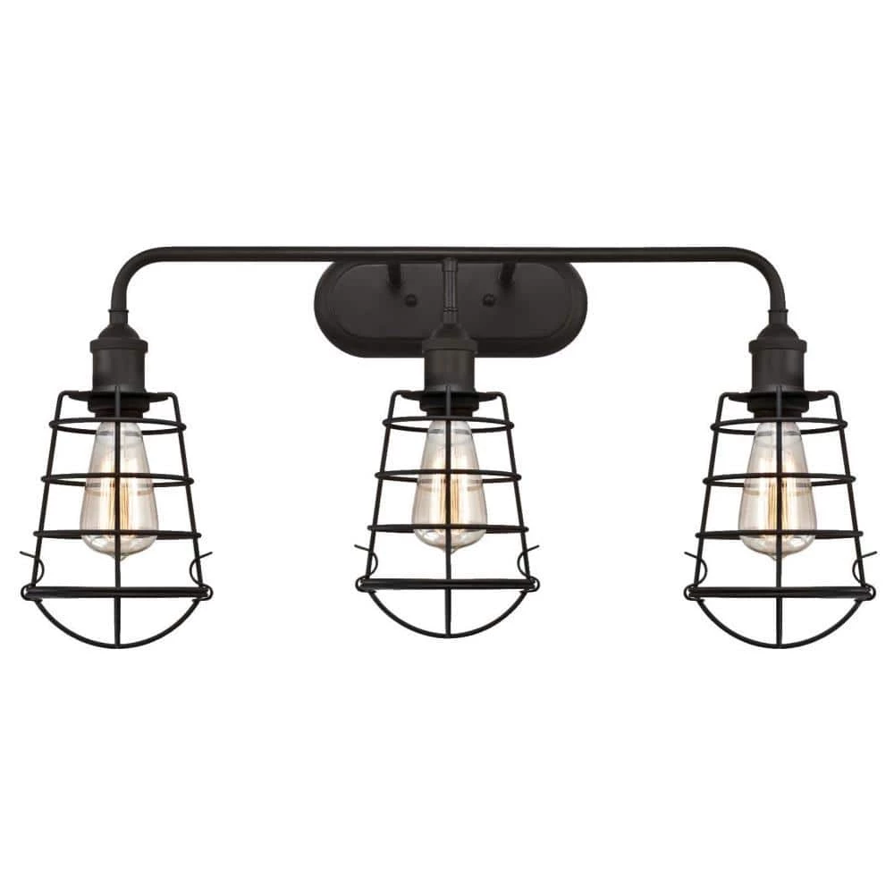Crafted to look like the originals of the early 20th century, this Oliver 3-Light Wall Fixture features a timeless oil rubbed bronze finish. The open metal cage shades add a nostalgic feel, and a latch on the bottom of the shade allows easy access for bulb changes. Install this wall fixture over a vanity or in a bedroom for a touch of retro ambience. The wall fixture measures 13-13/16 in. x 27-3/8 in. (H x W), extends 8-9/16 in. from the wall and back plate 3-15/16 in. by 9-13/16 in. (H x W).This Westinghouse indoor wall fixture is ETL/CETL listed for safety. It is backed by a 5-year limited manufacturer’s warranty against defects in materials and workmanship. Westinghouse is a trusted, global brand. Westinghouse knows lighting and offers products with exceptional quality, reliability and functionality. Product reference number 63380.