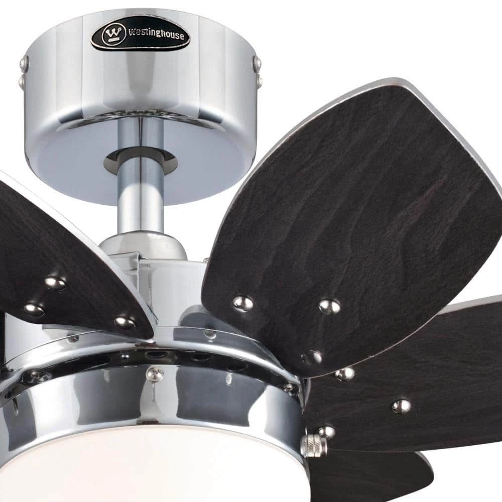 With a bright chrome finish and 6 angled blades, the Westinghouse Origami 24 in. fan has a modern ceiling fan design to add a dramatic focal point to any small-size room. The ceiling fan’s oblong light fixture with opal frosted glass includes an energy-efficient LED bulb for long-lasting, bright illumination. Coordinating blade finishes of wengue and beech complement the small ceiling fan beautifully. Westinghouse ceiling fans are backed by a lifetime warranty on the motor and a 2-year warranty on all other parts. Westinghouse is a trusted, global brand. Westinghouse knows lighting and offers products with exceptional quality, reliability and functionality. Product reference number 72369.