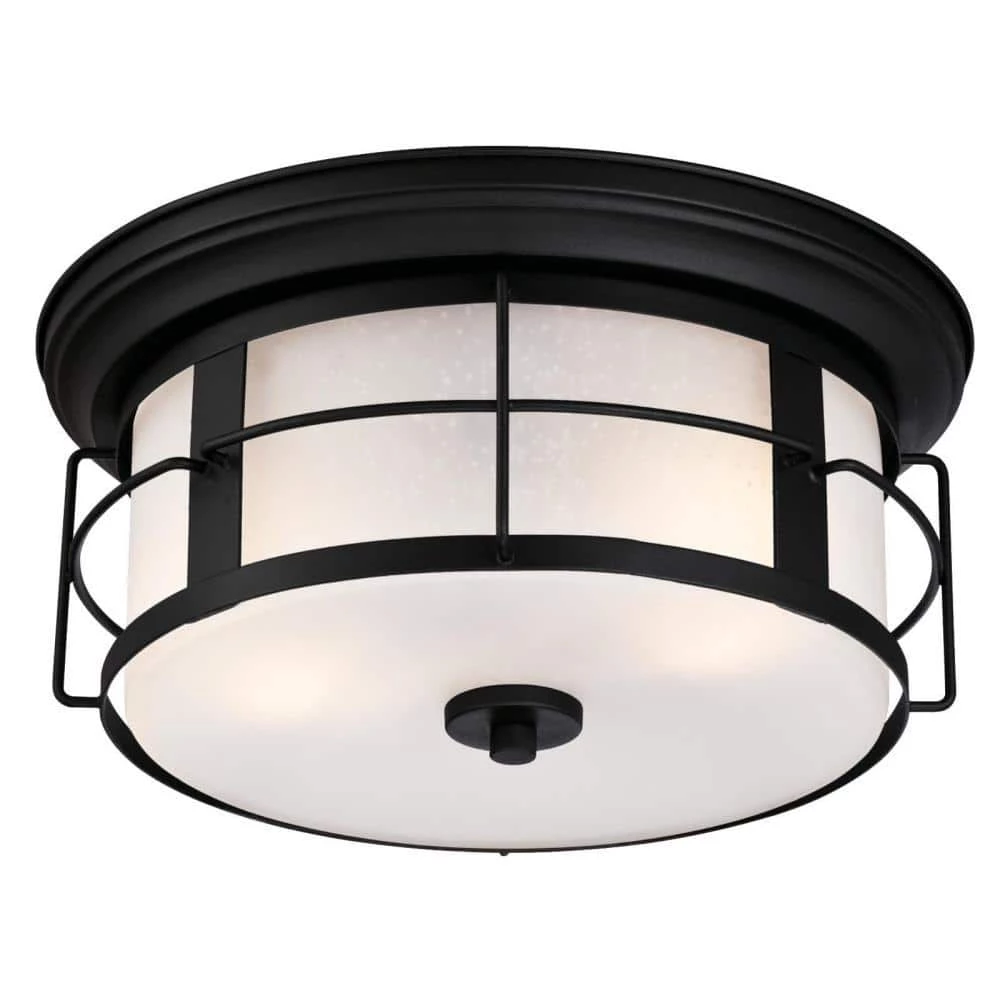 - Textured black finish ceiling fixture with frosted seeded glass adds ambiance