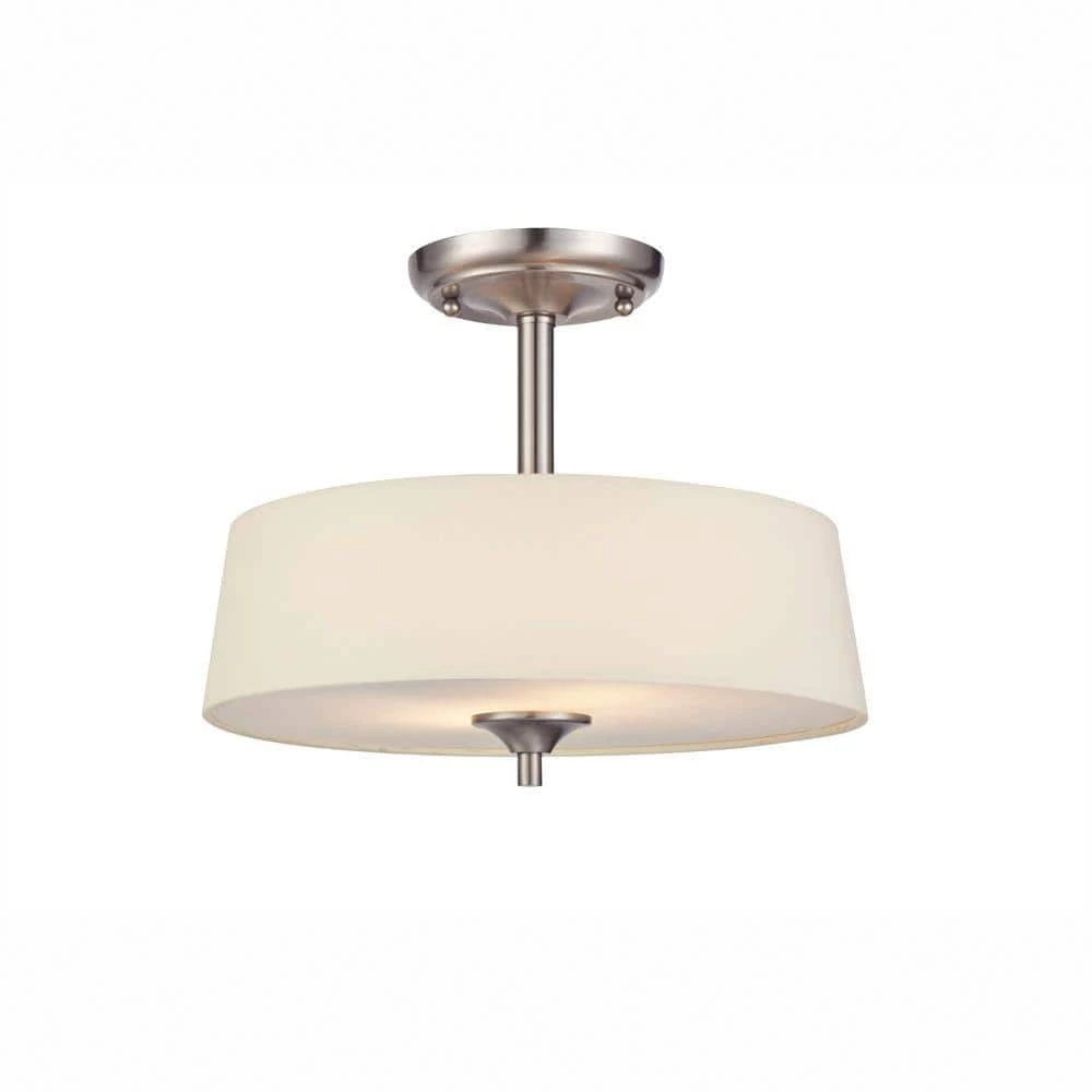 Add a modern focal point to your home with the Westinghouse Parker Mews 2-Light Ceiling Fixture. This fixture’s round white linen fabric shade filters light for soft but ample results. The sculpted rod, base, and finial have a brushed nickel finish for a clean and contemporary look. Install this ceiling fixture in a living room, kitchen, bedroom or hallway. Wherever you choose to hang it, you’ll enjoy the fixture’s contemporary style and welcoming light. It measures 10-3/4 in. x 13 in. (H x D). This Westinghouse interior ceiling fixture is UL listed for safety. It is backed by a 5-year manufacturer’s warranty against defects in materials and workmanship.