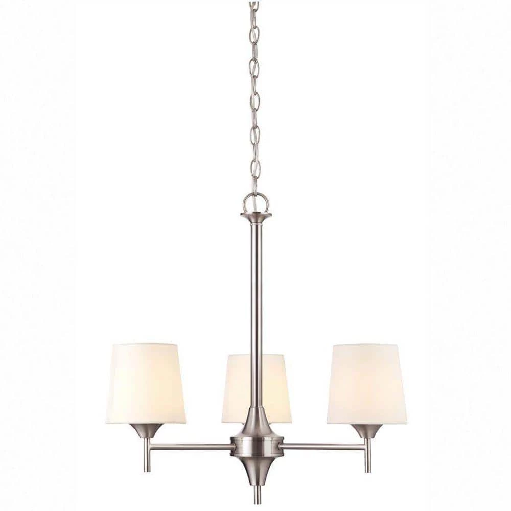 The Westinghouse Parker Mews 3-Light Chandelier will make an elegant focal point in contemporary spaces. Each of this fixture’s white linen fabric shades is attached to a sleek, straight arm. The fixture’s structural column and brushed nickel finish create a modern look. Install this chandelier in a foyer, hallway or dining room. The chain mount makes it ideal for rooms with high ceilings. The fixture is 23-1/8 in. x 23 in. (H x D). This Westinghouse interior hanging fixture is UL listed for safety. It is backed by a 5-year manufacturer’s warranty against defects in materials and workmanship.