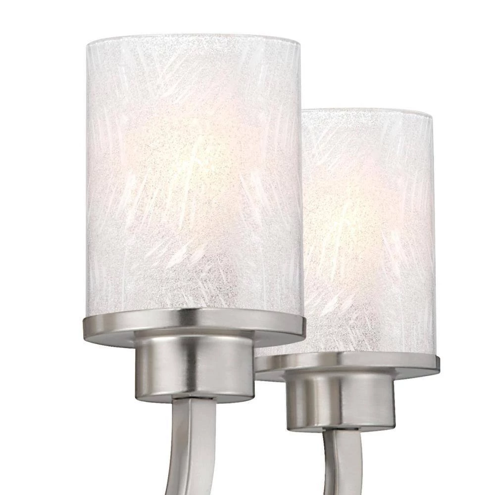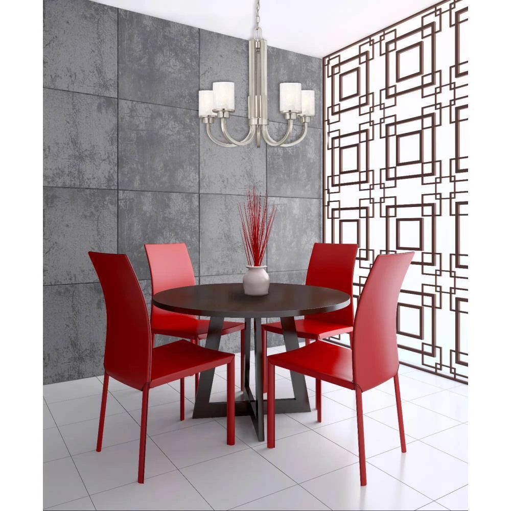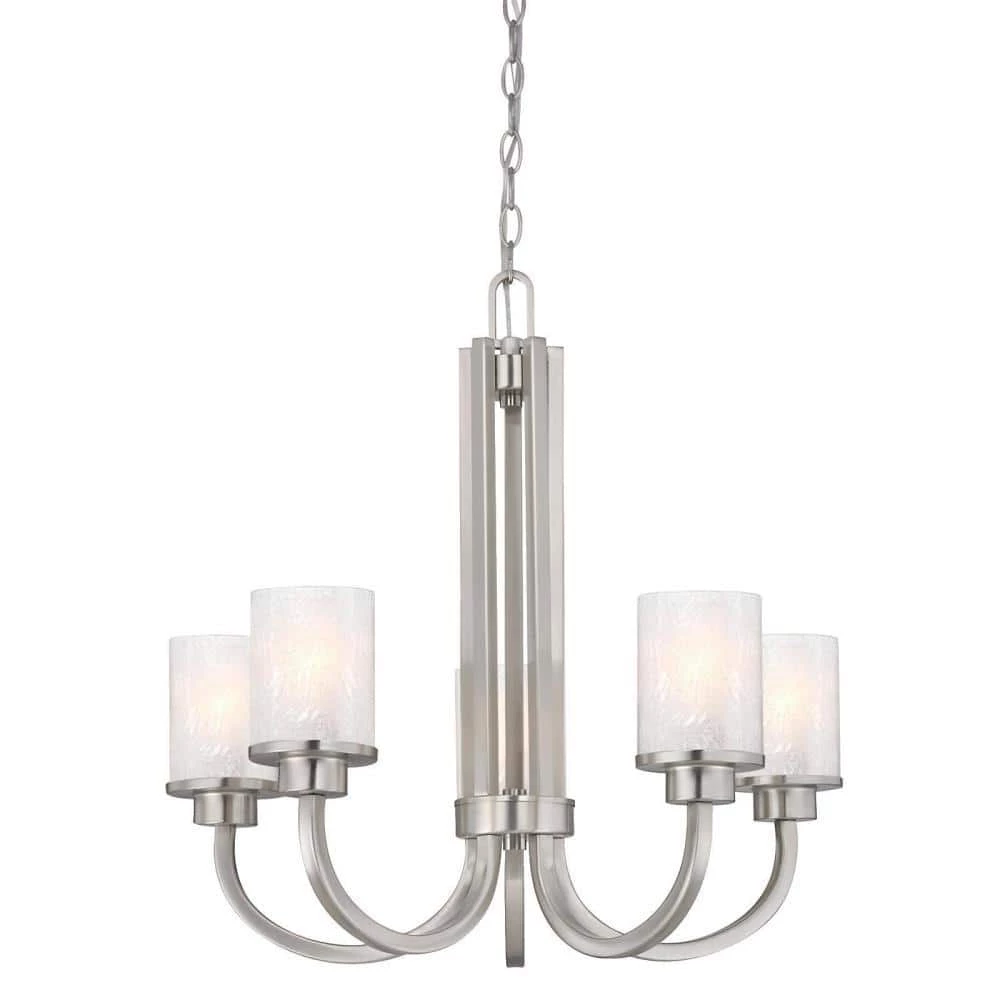 The Ramsgate 5-Light Chandelier is distinguished by its sweeping square arms and glistening cylindrical glass shades. This refined yet remarkable, transitional fixture will add style and beautiful illumination to any setting with its elegant brushed nickel finish and 5 ice glass shades. Install this chandelier in a dining room, living room or foyer. The chain mount makes it ideal for rooms with high ceilings. The chandelier measures 22 in. x 24 in. (H x D) and comes with a 36 in. chain and 60 in. cord. This Westinghouse indoor hanging fixture is UL/CUL listed for safety. It is backed by a 5-year limited manufacturer’s warranty against defects in materials and workmanship. Westinghouse is a trusted, global brand. Westinghouse knows lighting and offers products with exceptional quality, reliability and functionality. Product reference number 63080.