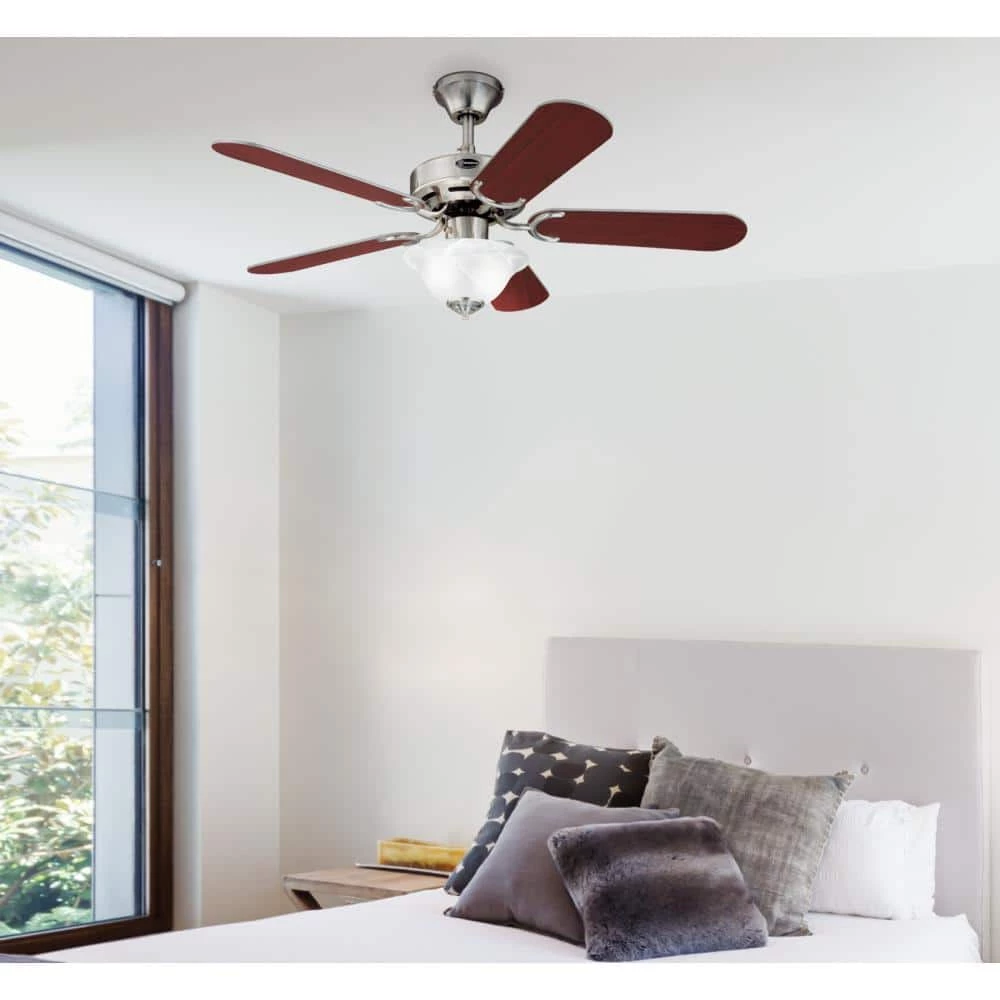 Add the characteristic style of the Westinghouse Richboro SE ceiling fan into any room, featuring a brushed nickel ceiling fan finish, 5 rosewood/light maple blades, and frosted white alabaster glass bowl. The 42 in. ceiling fan with light includes 2 energy-efficient candelabra G16-1/2 dimmable LED light bulbs for long-lasting brightness. Westinghouse ceiling fans are backed by a lifetime warranty on the motor and a 2-year warranty on all other parts. Westinghouse is a trusted, global brand. Westinghouse knows lighting and offers products with exceptional quality, reliability and functionality. Product reference number 72375.