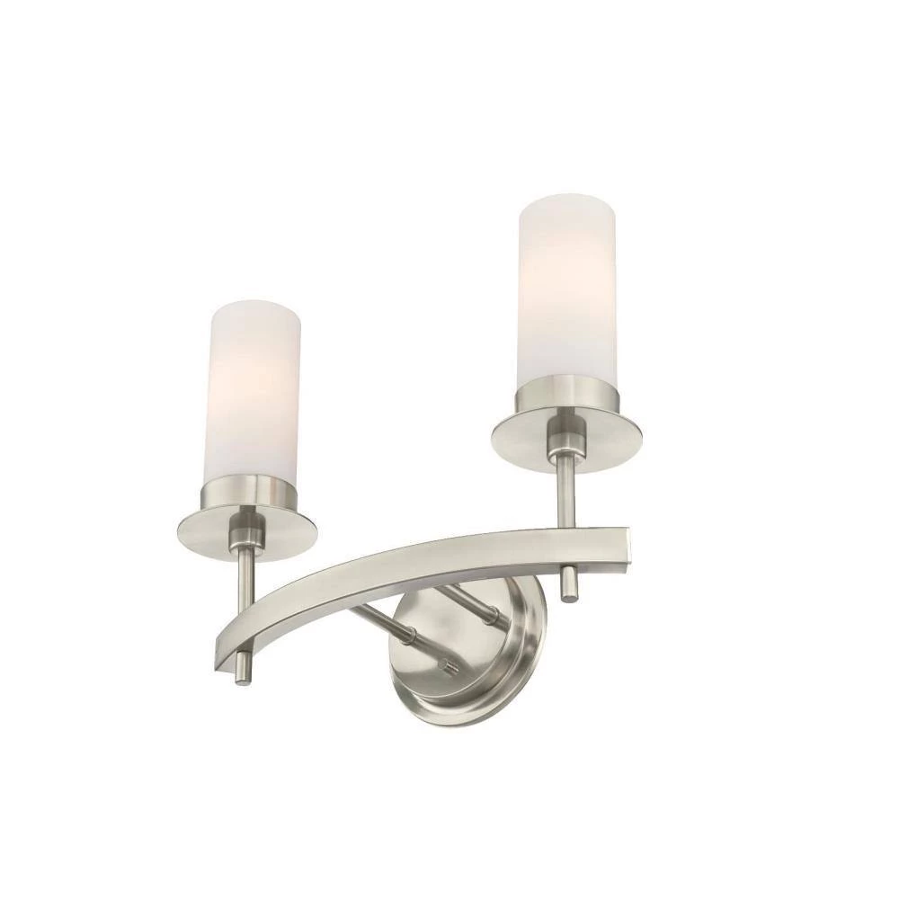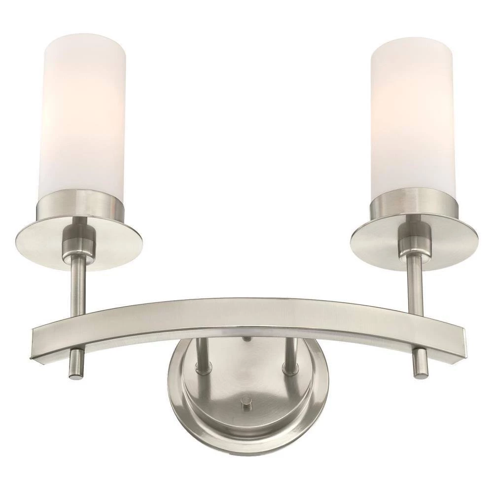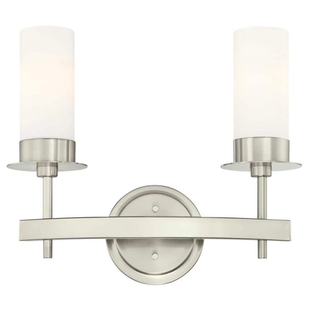 The refined elegance of the Roswell 2-Light Wall Fixture provides sophisticated style. The brushed nickel finish with tall frosted opal cylinders add sleek style and radiance. Install this wall fixture the bathroom, over a vanity or in a dining room for a touch of ambience. The wall fixture measures 14-5/16 in. x 16-9/16 in. (H x W), extends 5-13/16 in. from the wall and back plate 5-15/16 in. (D).This Westinghouse indoor wall fixture is ETL/CETL listed for safety. It is backed by a 5-year limited manufacturer’s warranty against defects in materials and workmanship. Product reference number 63272.