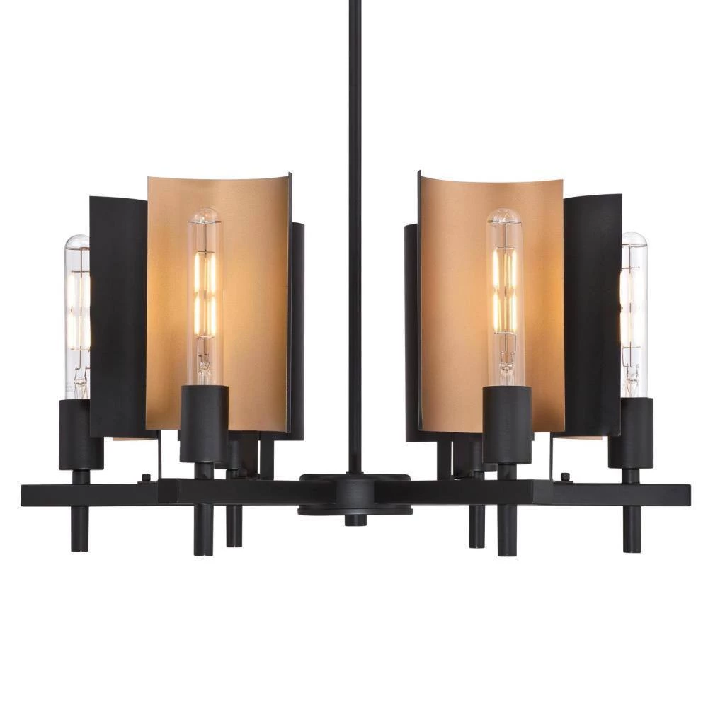 The unique vintage design of the Sirino six-light chandelier adds attractive illumination while making a distinct decorative statement. Perfect for any decor from industrial to contemporary, the matte black chandelier features outward facing shades with a metallic bronze finish. The chandelier measures 12-1/4 in. x 23-1/4 in. (H x D), maximum hanging length 34-1/4 in., adjustable rods (2) 4-3/4 in. length, (2) 9-1/2 in. length. May be installed on sloped ceilings, includes instructions and mounting hardware for easy installation. Westinghouse is a trusted, global brand. Westinghouse knows lighting and offers products with exceptional quality, reliability and functionality. Product reference number 65758.