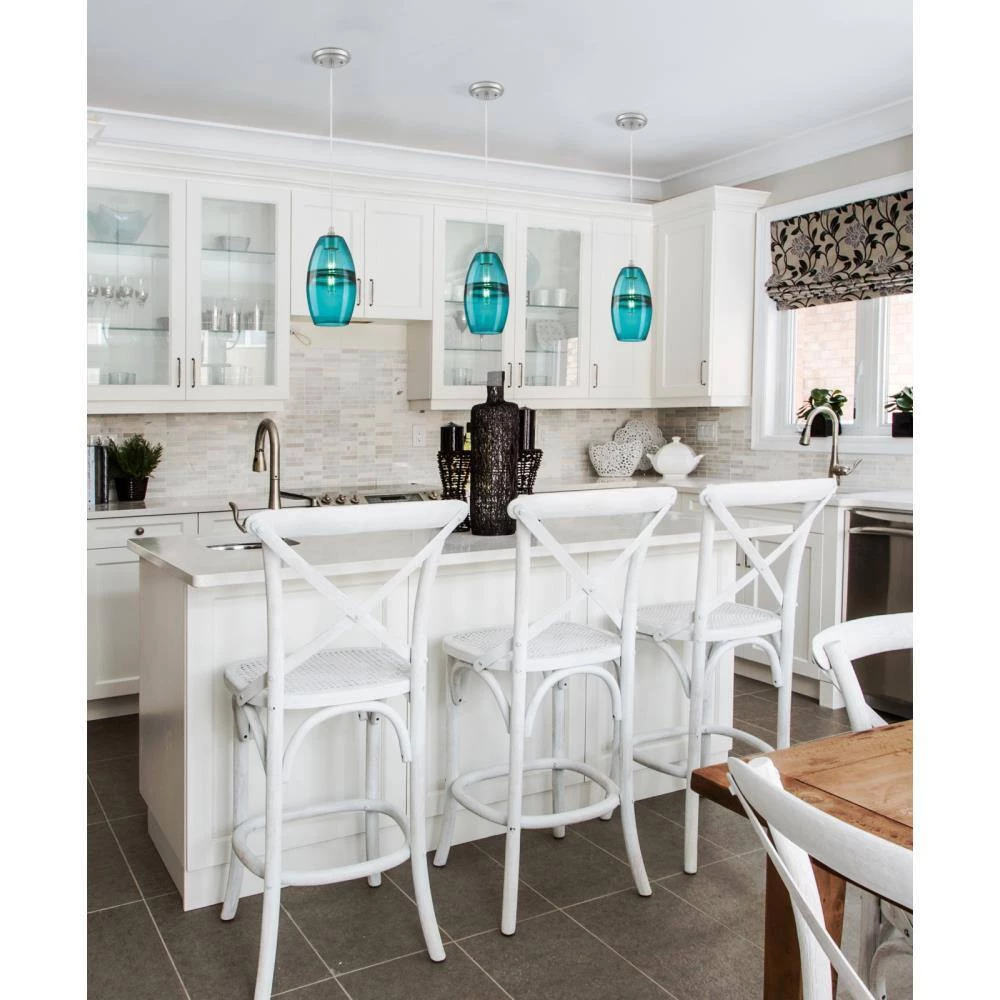 The Westinghouse mini pendant design makes a distinctive statement in any room. The hand blown turquoise glass shade with an artistic twist of black is fused with a brushed nickel finish pendant. Adds beauty and style to interior decor. Hang one or more pendants over your kitchen island or table to illuminate the heart of your home. Creates ambiance in a small dining area or bedroom. The lovely Soren brings a calm, tranquil feel to any space. Westinghouse is a trusted, global brand. Westinghouse knows lighting and offers products with exceptional quality, reliability and functionality. Product reference number 63663.