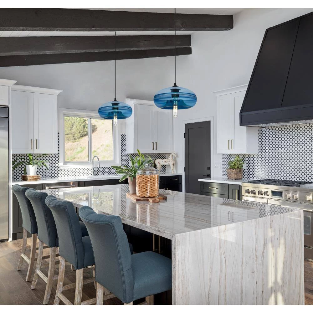 The Westinghouse Soren pendant makes a distinctive design statement. The lovely hand blown sapphire glass paired with a matte black finish pendant brings a pop of color to your home. Hang one or more pendants over your kitchen island or table, or illuminate a small dining area or bedroom while adding a touch of modern style. Westinghouse is a trusted, global brand. Westinghouse knows lighting and offers products with exceptional quality, reliability and functionality. Product reference number 63665.