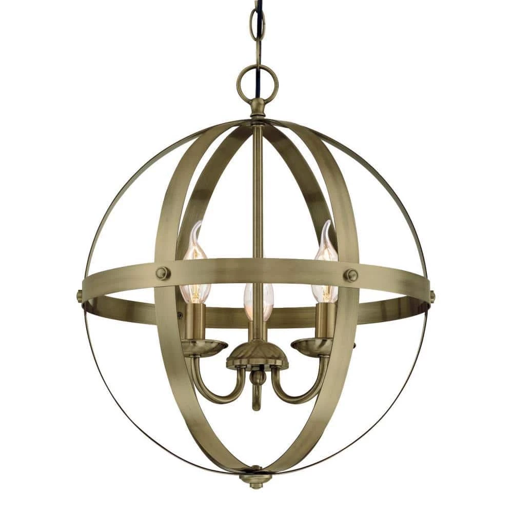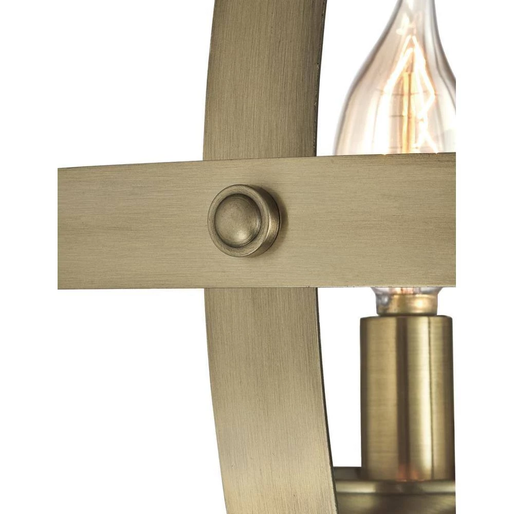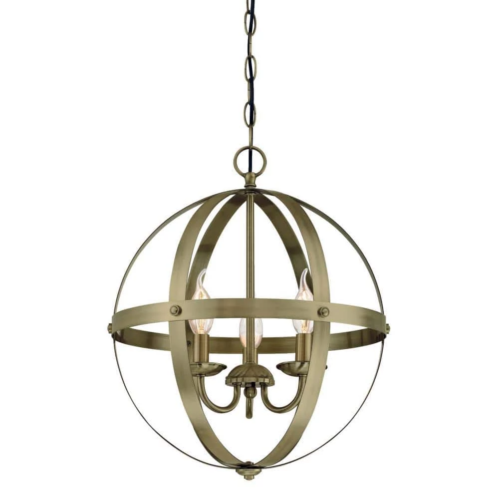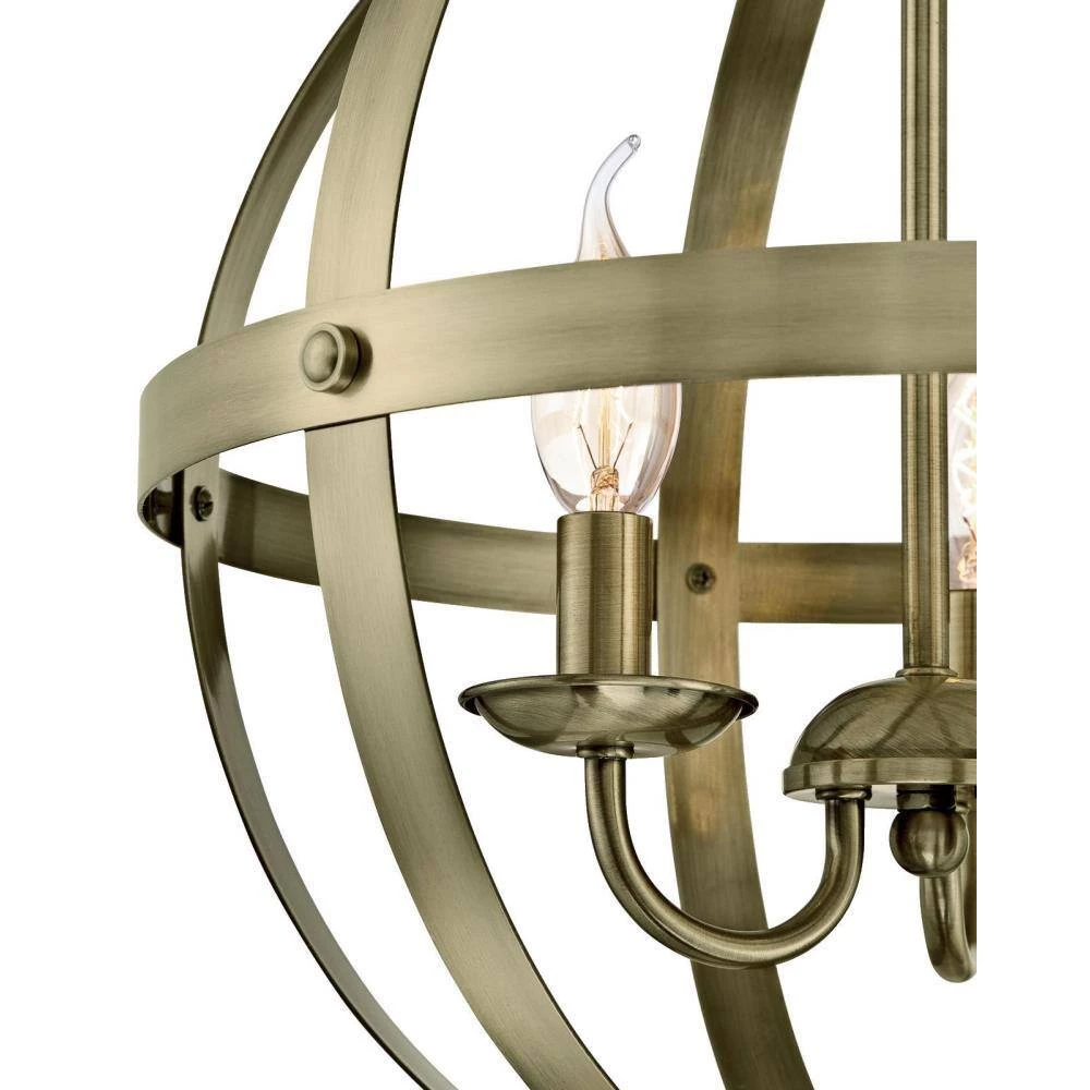 - Antique brass bands surround candelabra style bulbs in this open sphere chandelier