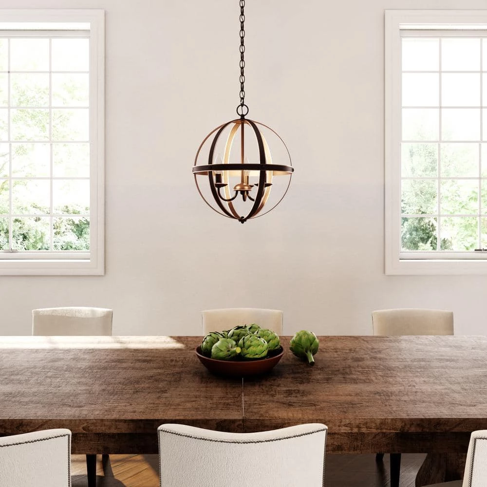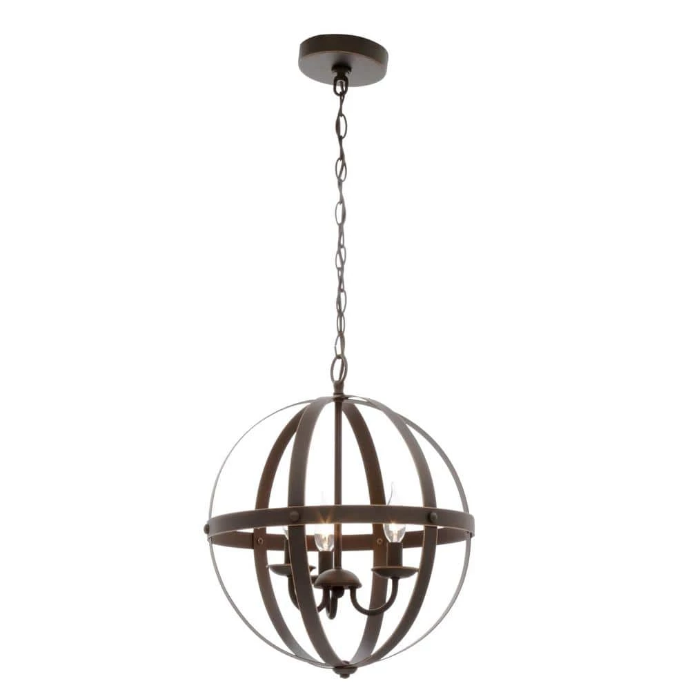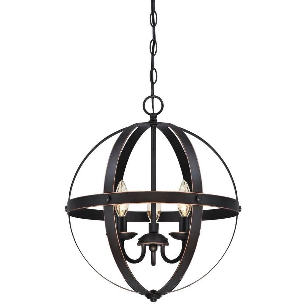 Evoking industrial charm, this vintage inspired Westinghouse 3-light pendant adds a warm accent to any decor. The open sphere pendant is designed with wide metal bands in rich oil rubbed bronze finish with highlights. This fixture commands attention with its industrial undertones and casual vintage look. Install this fixture in a variety of spaces like foyers and dining rooms. The adjustable chain makes it ideal for rooms with high or low ceilings. Wherever you place it, you will enjoy the fixture’s soft light and timeless appeal. The fixture has a height of 17-1/4 in., Dia. of 15-1/16 in. and comes with a 36 in. chain and 60 in. cord. It uses 3 candelabra-base light bulbs, 40-Watt maximum (not included). This Westinghouse interior hanging fixture is ETL/CETL listed for safety. It is backed by a 5-year limited manufacturer’s warranty against defects in materials and workmanship. Westinghouse is a global brand with a simple philosophy: make life easier for everyone who buys its products. Westinghouse products are designed for exceptional quality, reliability, and functionality. Product reference number 63418.