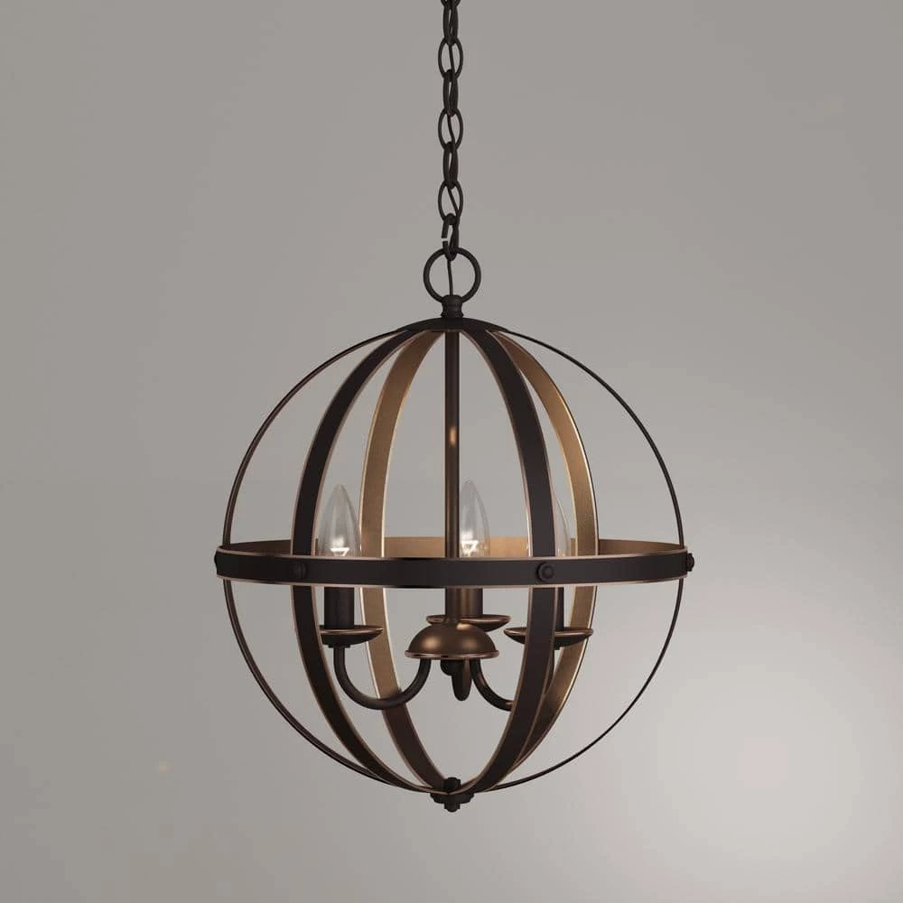 - Wide metal bands surround candelabra style bulbs in this open sphere vintage inspired pendant