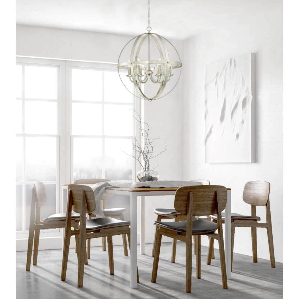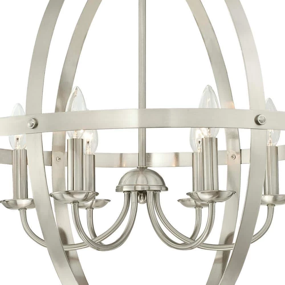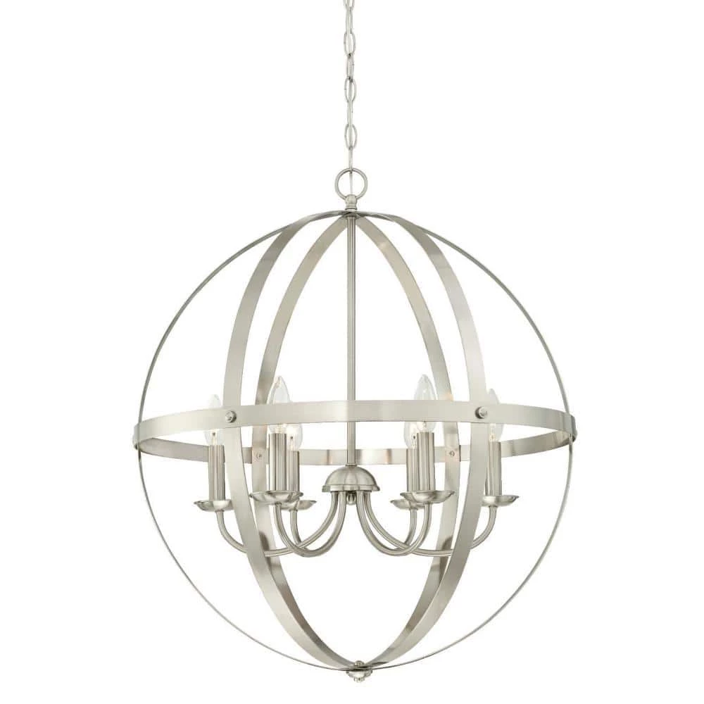 Elegant style, the Westinghouse 6-Light Chandelier adds a dramatic accent to any decor. The open sphere design chandelier is embellished in a contemporary brushed nickel finish. This chandelier is captivatingly stylish. Install one or two over large kitchen islands or dining room tables, living room or foyer in industrial, contemporary and transitional homes. The chandelier measures 26-15/16 in. x 24 in. (H x D), chain 36 in. long, cord is 60 in. long. Backed by a 5-year limited manufacturer’s warranty against defects in materials and workmanship. Westinghouse is a trusted, global brand. Westinghouse knows lighting and offers products with exceptional quality, reliability and functionality. Product reference number 63283.