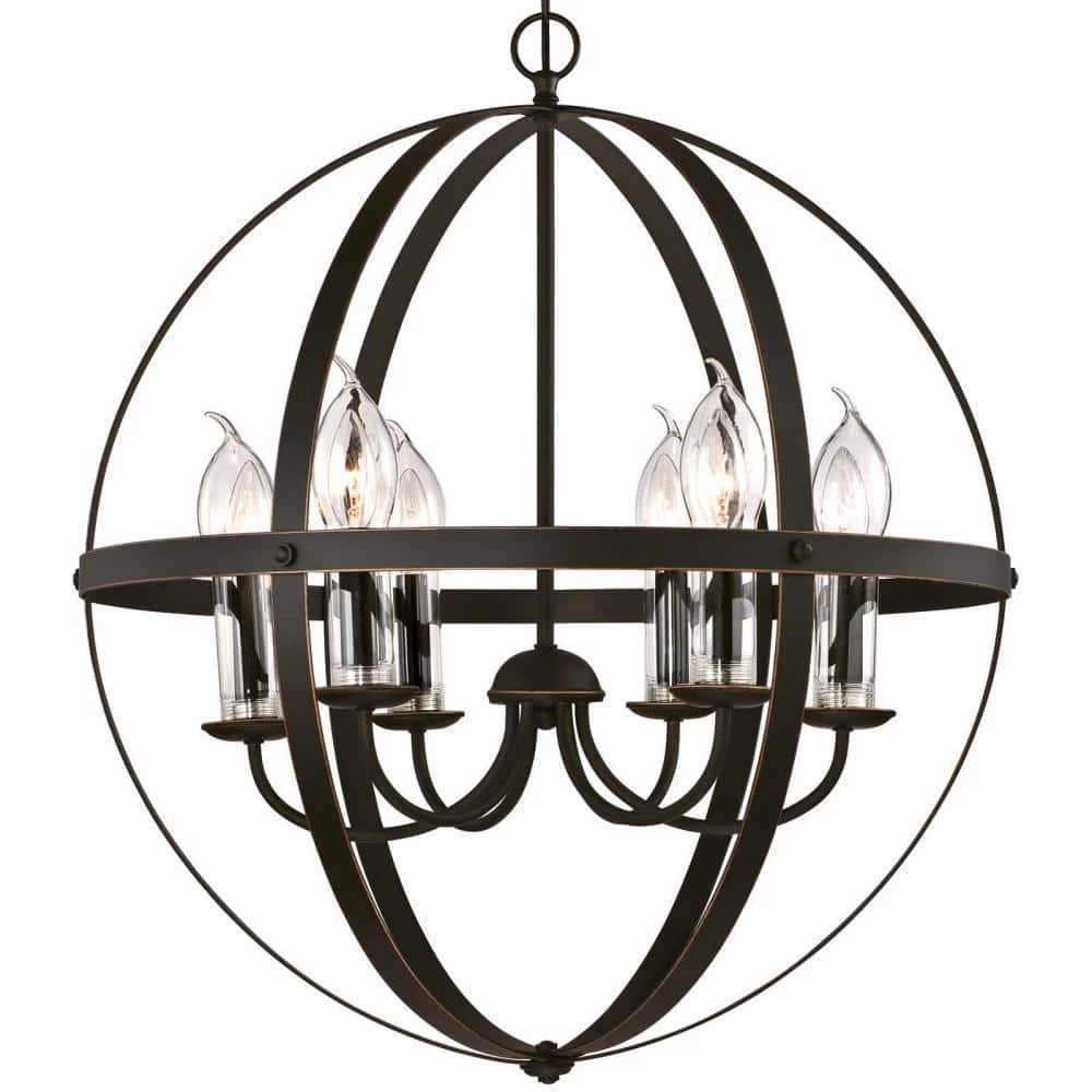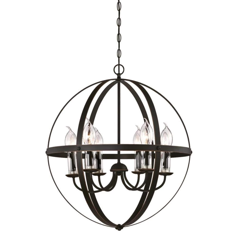 - Oil rubbed bronze finish open sphere encloses a candelabra with clear hand blown glass candle covers giving this chandelier its industrial feel