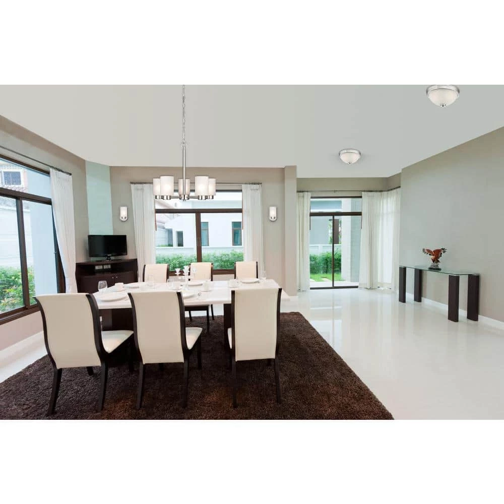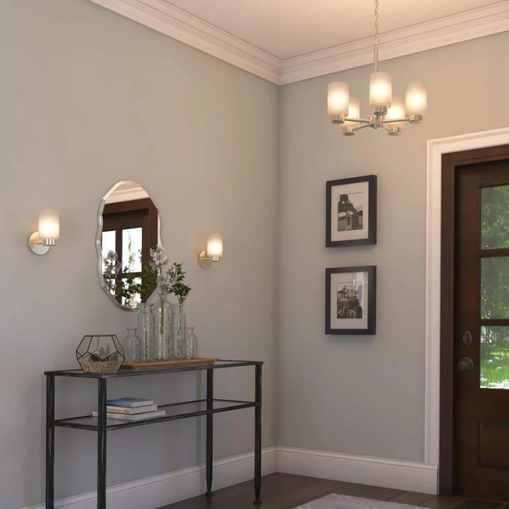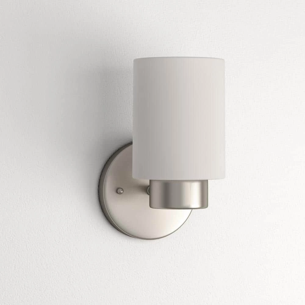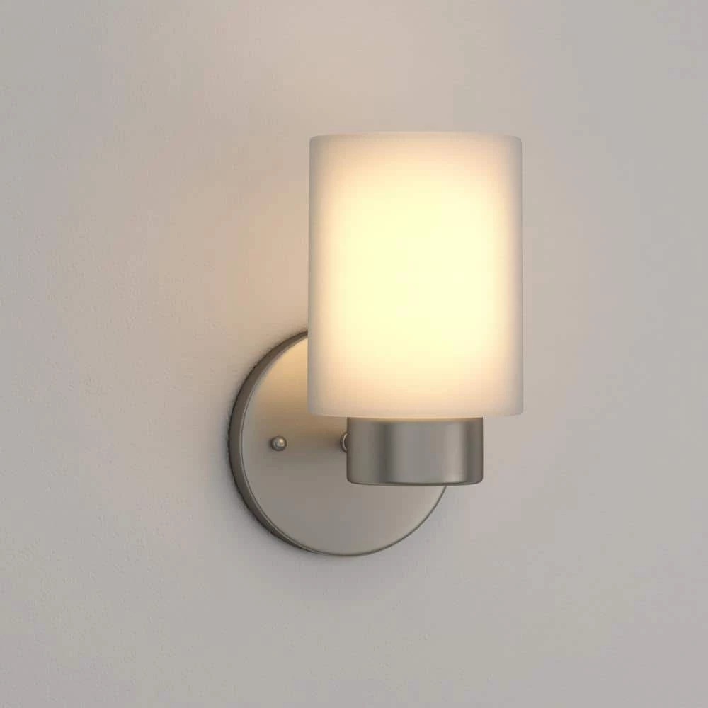 The Westinghouse Sylvestre 1-Light Wall Fixture brings sleek, sophisticated style to your home. With its cylindrical frosted seeded glass shade and brushed nickel finish, the fixture features a modern design that complements a wide range of decor. The fixture measures 8-1/4 in. x 4-3/4 in. (H x W) and extends 6-1/4 in. from the wall. It is ideal for use in bathrooms, bedrooms and entryways. This Westinghouse interior wall fixture is CETL Listed for safety. It is backed by a 5-year manufacturer’s warranty against defects in materials and workmanship.