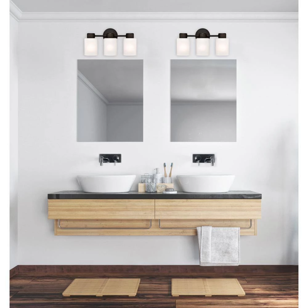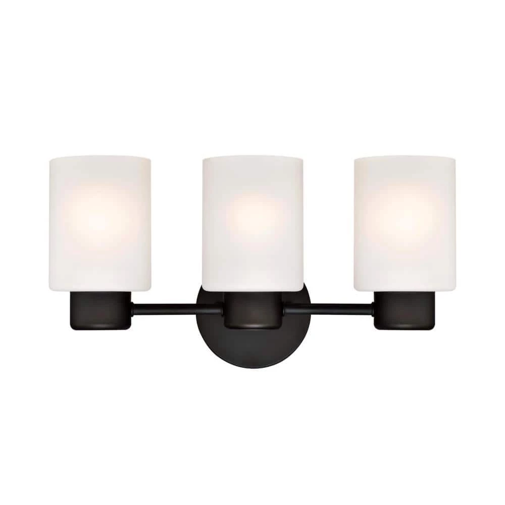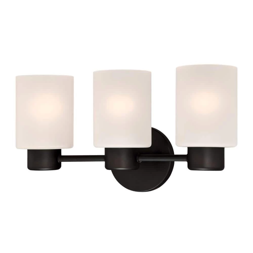The Westinghouse Sylvestre 3-Light Wall Fixture brings sleek, sophisticated style to your home. With its cylindrical frosted glass shades and oil rubbed bronze finish, the fixture features a modern design that complements traditional and contemporary style homes. Install this wall fixture up or down, in the bathroom, powder room or bedroom, over a sink or vanity. The fixture measures 8-1/4 in. x 15-3/4 in. (H x W), extends 6-1/4 in. from the wall and back plate 4-3/4 in. (D). Westinghouse is a trusted, global brand. Westinghouse knows lighting and offers products with exceptional quality, reliability and functionality. Product reference number 63541.