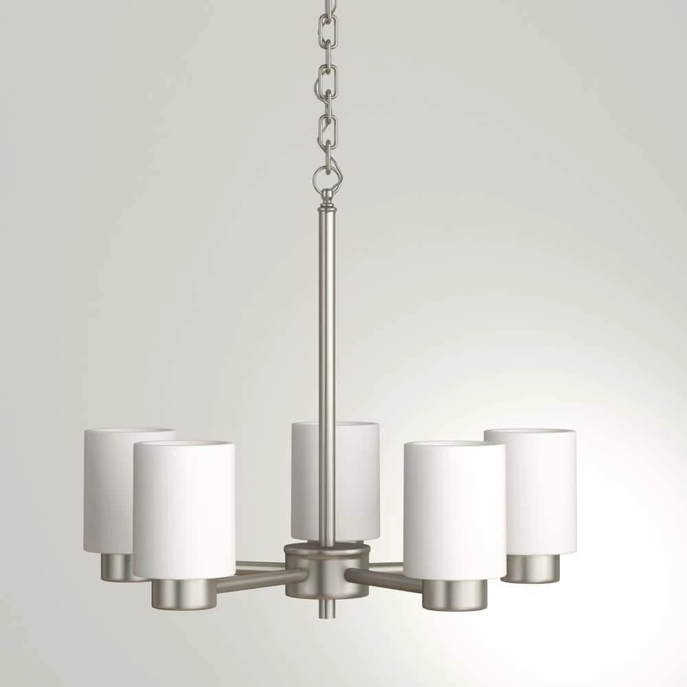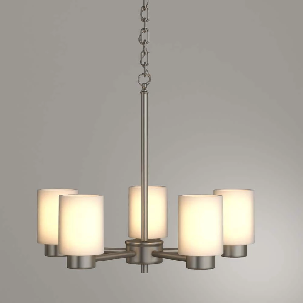 The Westinghouse Sylvestre 5-Light Chandelier features a brushed nickel finish and a sophisticated design. Five lights, covered by cylindrical frosted seeded glass shades, provide bright illumination. This fixture’s minimalist lines adds a modern touch to the chandelier. Install this fixture in your 2-story entryway, kitchen, or dining room. The chain mount makes it ideal for rooms with high ceilings. Wherever you place it, you will enjoy the fixture’s radiant light and modern design. Westinghouse is a trusted, global brand. Westinghouse knows lighting and offers products with exceptional quality, reliability and functionality. Product reference number 62274.