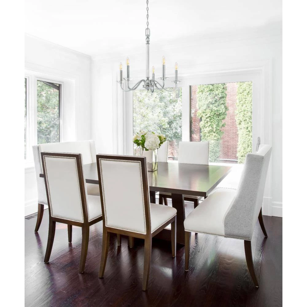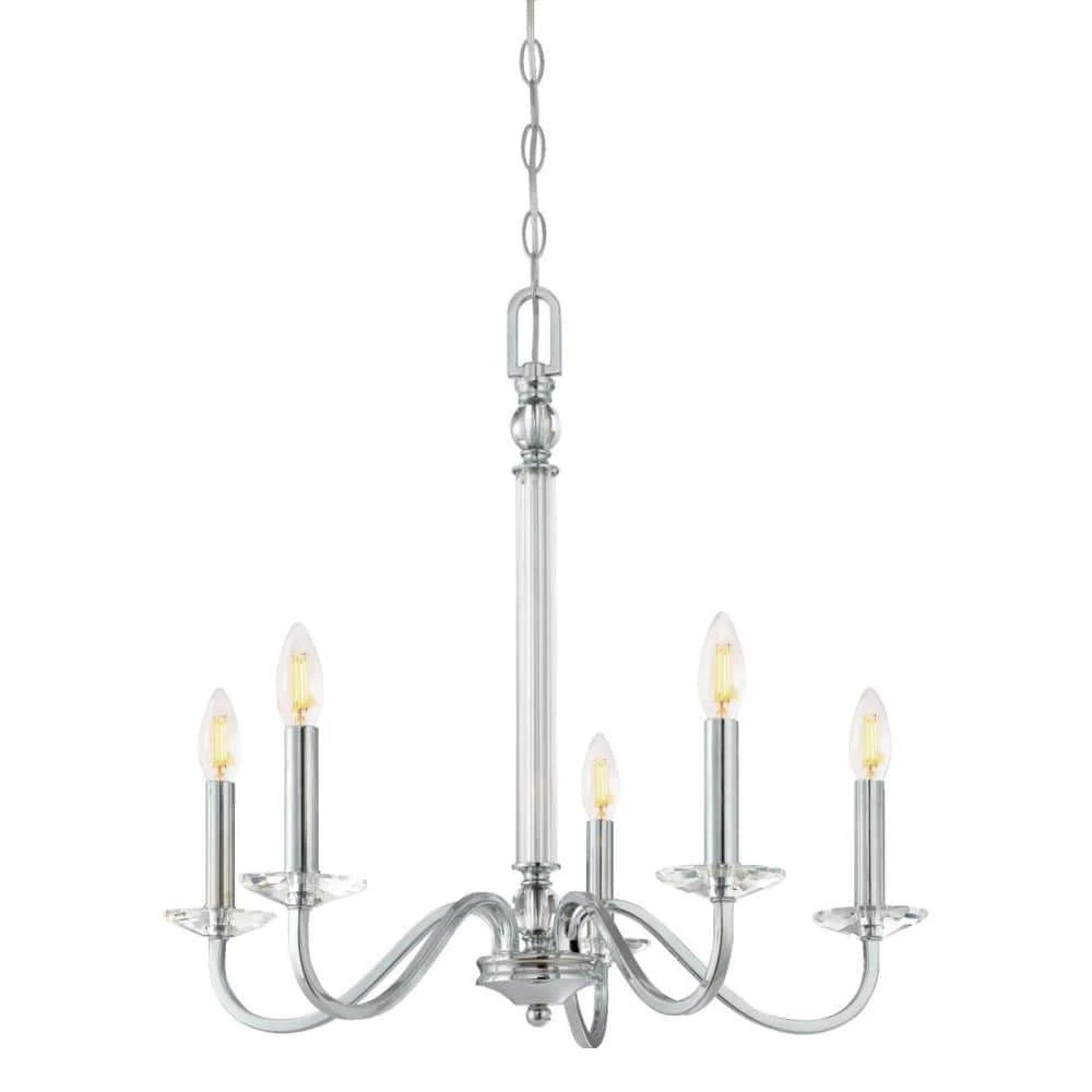 The contemporary design of the Versailles 5-Light Chandelier makes a luxurious centerpiece with its a sleek finish and sparkling accents. The lustrous chrome finish with clear glass accents is perfect for adding shine in any room. Make a statement in a foyer or living room, over a large dining room table, kitchen island or walk-in closet. The chandelier measures 21-1/2 in. x 22-1/4 in. (H x D), chain 36 in. long, cord is 60 in. long. Backed by a 5-year limited manufacturer’s warranty against defects in materials and workmanship. Westinghouse is a trusted, global brand. Westinghouse knows lighting and offers products with exceptional quality, reliability and functionality. Product reference number 63342.