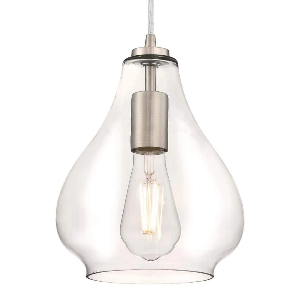- Brushed nickel mini pendant with hand blown clear glass adds refined vintage appeal