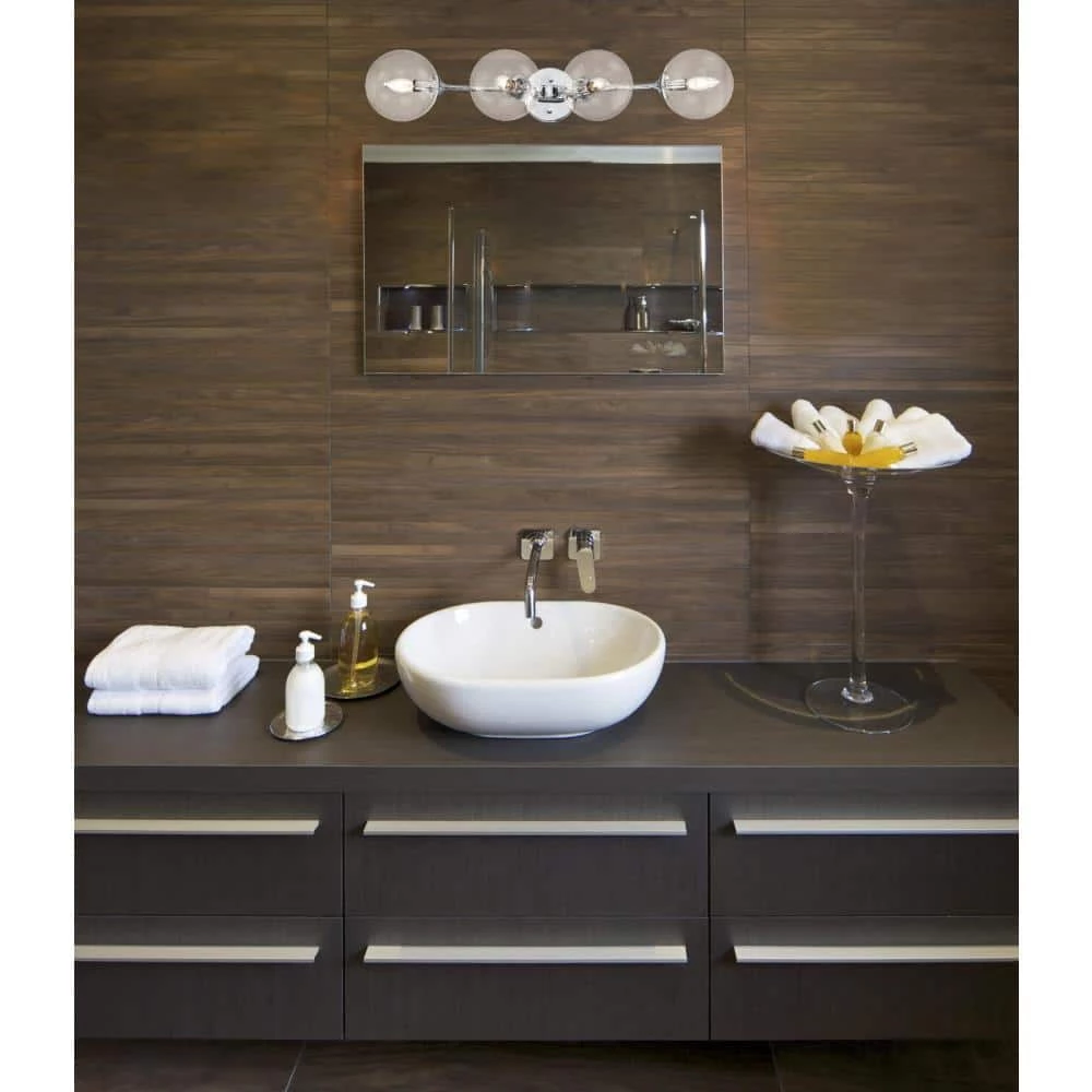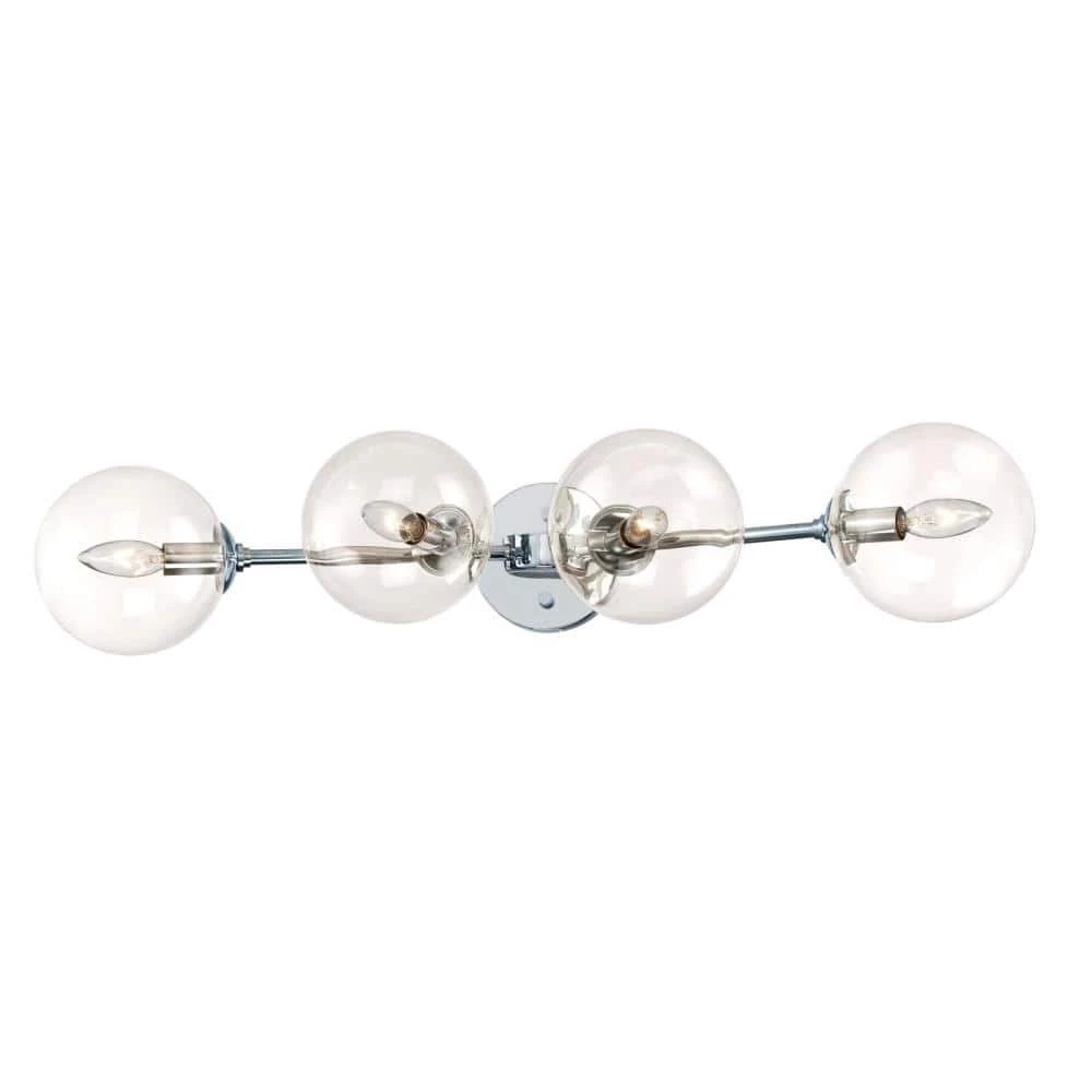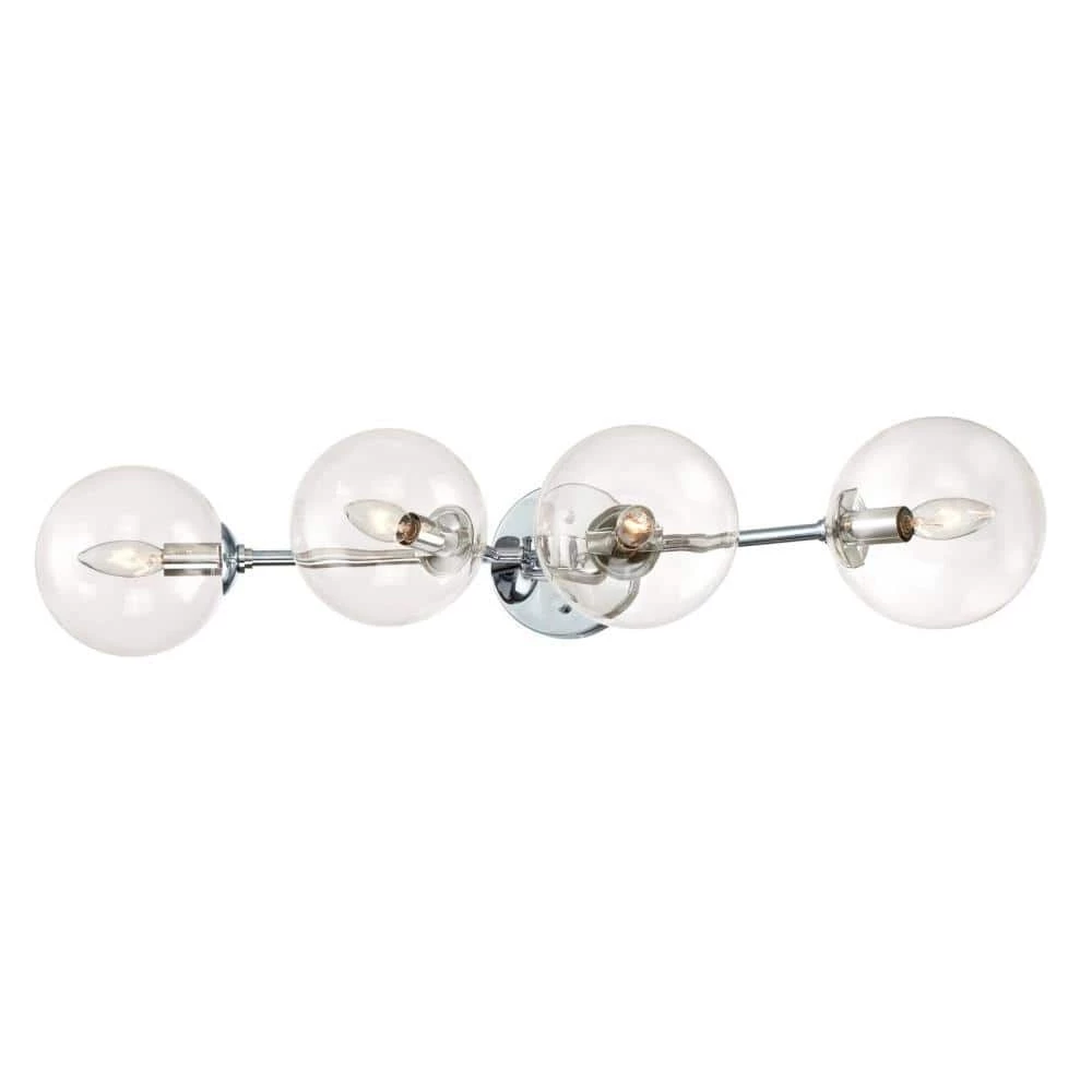 The Westinghouse Zaffron 4-Light Wall Fixture brings contemporary shine to any room in your home.vibrant, chrome finish and brilliant glass orbs brighten bathrooms, powder rooms, vanities, bedrooms, dining rooms and more. The Zaffron measures 6 in. x 31-1/2 in. (H x W), extends 9-1/2 in. from the wall and back plate diameter 5-1/8 in. Westinghouse is a trusted, global brand. Westinghouse knows lighting and offers products with exceptional quality, reliability and functionality. Product reference number 63562.