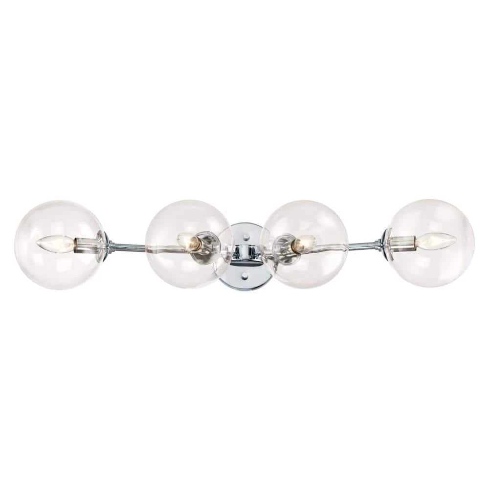- Features a bright chrome finish and clear glass globes